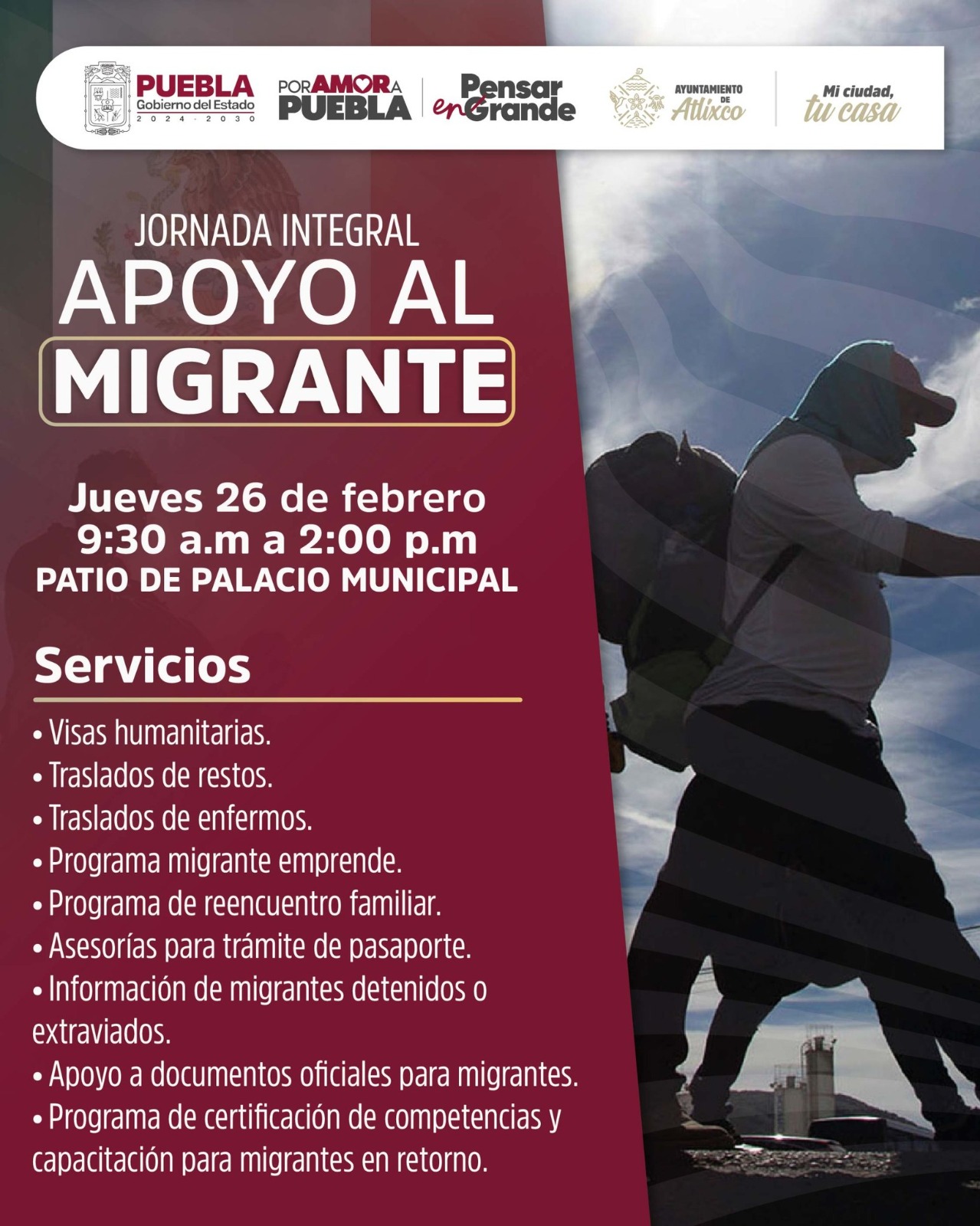 Atlixco, Puebla.- La presidenta municipal Ariadna Ayala convocó a la ciudadanía a participar en la Jornada Integral de Apoyo al Migrante , programada para el jueves 26 de febrero de 9:30 a 14:00 horas , en el Patio del Palacio Municipal de Atlixco.