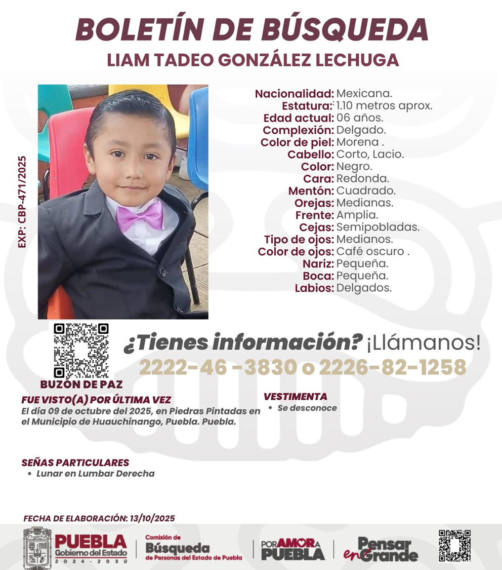 El pequeño Liam Tadeo González Lechuga de 6 años fue reportado como desparecido tras un deslave en la colonia Piedras pintadas, en la Sierra Norte de Puebla.
